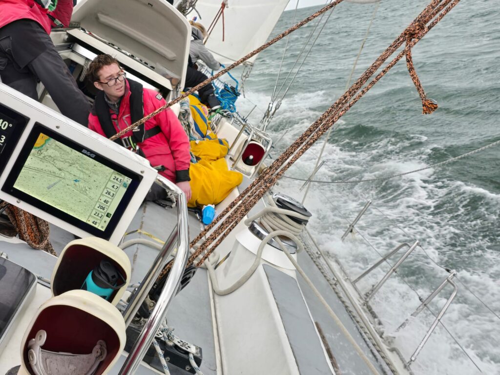 We slowly entered into a storm, and I never had to face anything like this before. First time in my life sailing and going through a storm, whoa what an experience! We were shaken and splashed as I could hear the screams from people managing at the front. I was still sat down still focused at looking at the horizon completely weakened and seasick and couldn’t hold my stomach. Walls and mountains of water around us, remained quiet in self control. As well as managing my emotions in admiring the spectacle with the immense cliffs of the isle of Wight in the background.