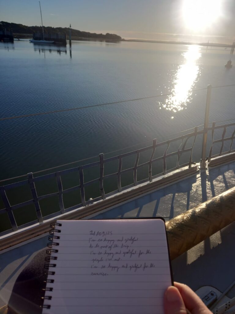 Sleeping in the middle of water was a very special and unique experience. It was like a kid dream for me and so grateful. However my night was very short because I’m not used to sleep on a boat that moves side to side. Also sleeping on a hammock instead of my cosy bed at home was a challenge for my. But felt gratitude to be where I am in this moment. Because the aim was to get out of my comfort zone! I didn’t sleep well that night because I’m also not to go to bed past midnight. Felt groggy and tired but felt good after all. Even though I’ve got morning rituals thrown out. Took part in the roundtable where the captain and crew members explained about our route, weather, safety and lifejackets…